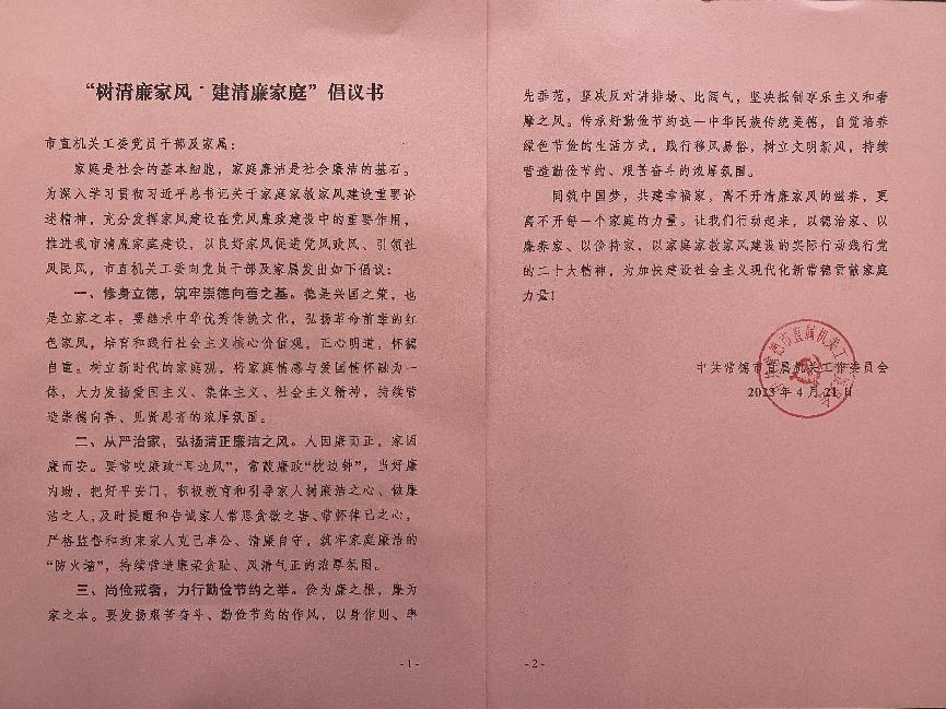 为深入学习贯彻习近平总书记关于家庭家教家风建设重要论述精神,充分发挥家风建设在党风廉政建设中的重要作用,推进常德市直机关工委清廉机关建设,4月21日下午,常德市直机关工委开展“家庭助廉 团团圆圆”主题活动,工委在家班子成员、干部职工及部分家属参加。