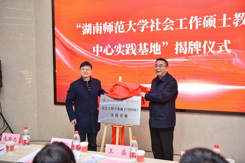 湖南省人民医院党委书记谭李红、湖南师范大学公管学院院长毛新志为“湖南师范大学社会工作硕士教育中心实践基地”揭牌,医校合作实践基地正式落户湖南省人民医院,为培养医务社工后备人才打下基础。