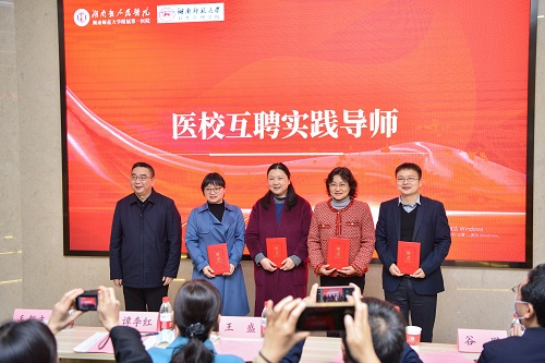 湖南省人民医院党委书记谭李红与湖南师范大学公共管理学院院长毛新志为七位社工实践指导老师颁发聘书。高校教师和医院党办、社工办成员担任督导,为医务社工研究生深入临床一线服务提供理论和实践指导。
