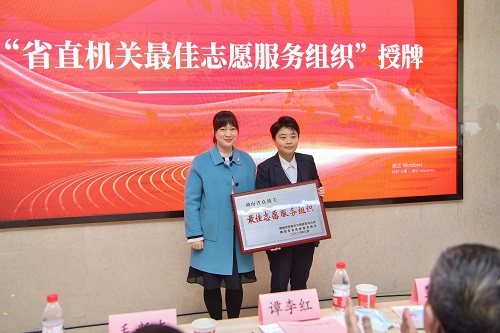 省直机关工委宣传部部长、文明办主任王盛为湖南省人民医院志愿服务队授牌“省直机关最佳志愿服务组织”。