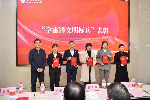 省直机关工委宣传部副部长谷飚为五位志愿者颁发“学雷锋文明标兵”荣誉证书。