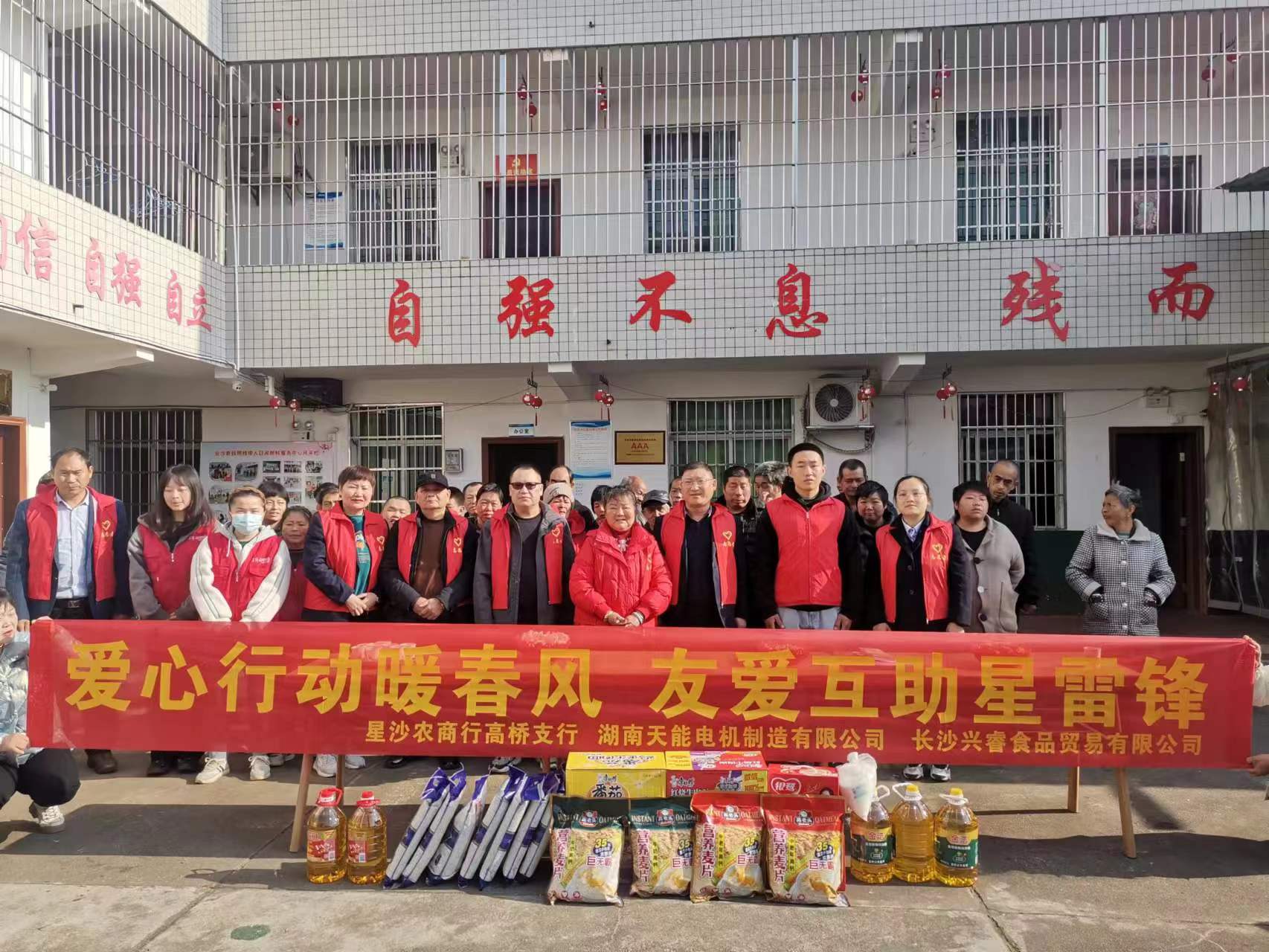 星沙农商银行志愿者联合当地企业在长沙县钰玥残疾人日间照料服务中心开展“爱心行动暖春风、友爱互助星雷锋”主题活动。星沙农商银行高桥支行工作人员与其他企业的志愿者们穿着红色马甲,为中心的老人小孩送去了大米、食用油、画笔等爱心物资。志愿者们帮助老年朋友打扫房间卫生,和老人们拉家常,讲解春季养生知识,教他们使用手机软件,鼓励老人保持积极乐观心态。为孩子们讲解“什么是雷锋精神”,寄语孩子们要友爱互助学雷锋,将雷锋精神传承下去。