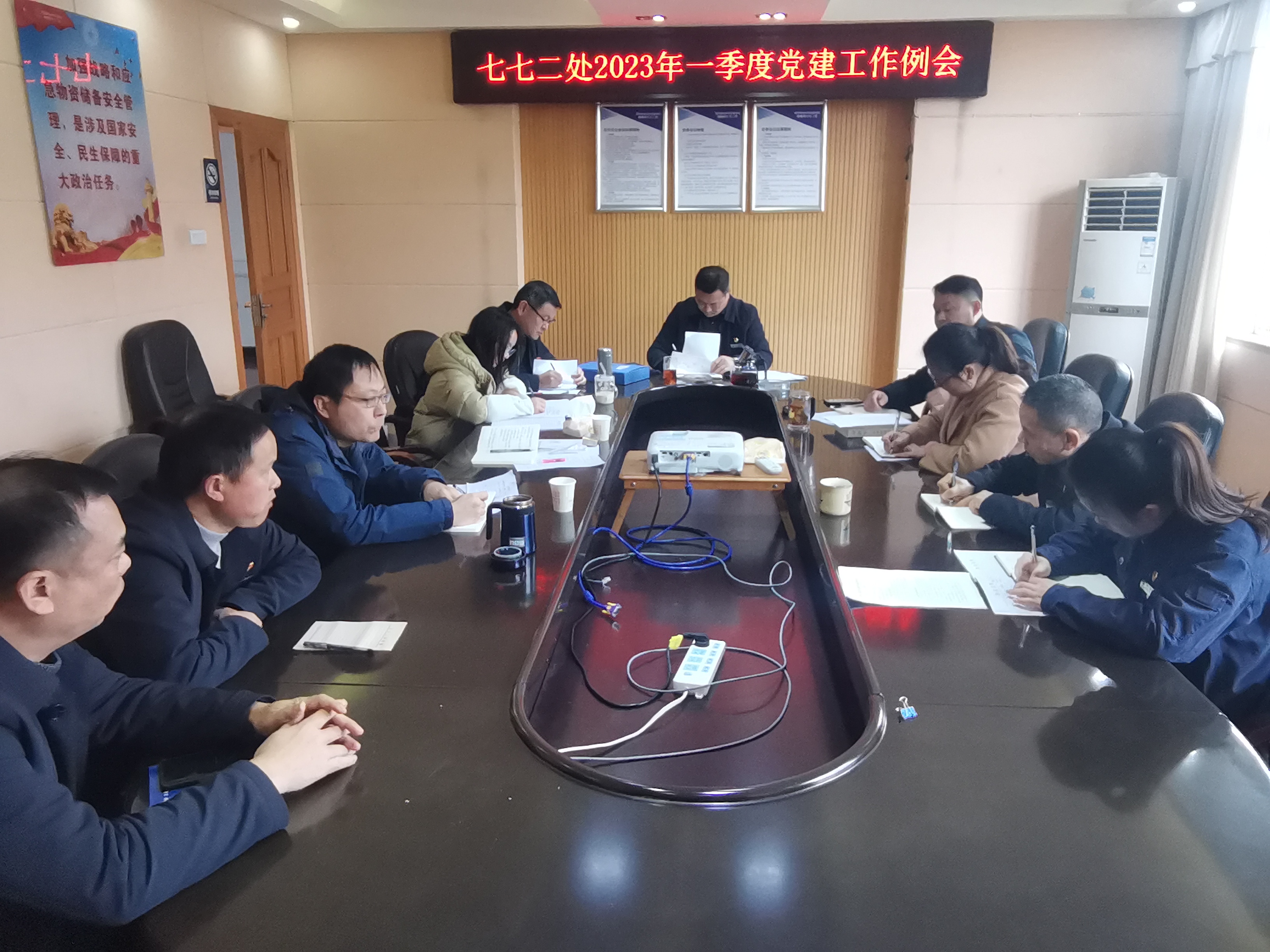 2月27日上午,国家粮食和物资储备局湖南局七七二处党委召开2023年度第一季度党建工作例会,纪委书记唐文波主持,处党委书记、处长毕庭出席,各党支部书记及支委成员、党小组组长参加会议。