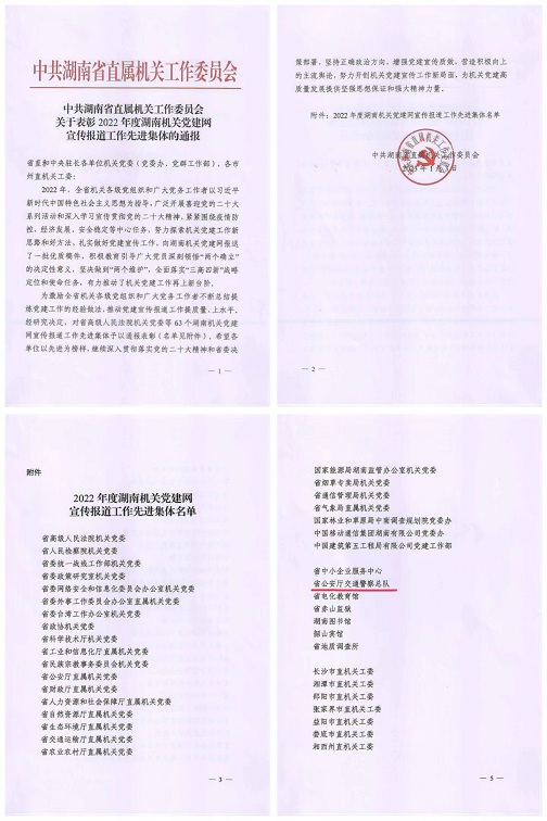 近日,省直机关工委印发《中共湖南省直属机关工作委员会关于表彰2022年度湖南省机关党建网宣传报道工作先进集体的通报》,交警总队荣获“2022年度湖南机关党建网宣传报道先进集体”称号。