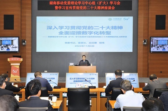 11月6日-7日,湖南移动召开学习宣传贯彻党的二十大精神座谈会,以党的二十大精神为指引谋划公司今后一个时期发展工作,推动公司上下把学习宣传贯彻工作不断引向深入。省公司党委书记、董事长、总经理程伟出席会议并讲话,党委班子结合座谈交流情况和分管领域工作,分别就进一步抓好党的二十大精神学习宣传贯彻工作提出要求。会上,程伟书记作了题为《深入学习贯彻党的二十大精神 全面迎接数字化转型》的讲话,围绕完整准确全面把握党的二十大精神、系统谋划全面迎接数字化转型思考两个方面进行了授课。