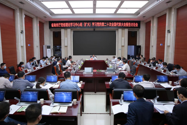 10月16日,省商务厅组织全体党员干部职工集中收看中国共产党第二十次全国代表大会开幕会,随即开展厅党组理论学习中心组(扩大)学习。厅党组副书记谭平主持学习并讲话,厅领导、省商务服务中心主任、厅机关二级巡视员、处室负责人等参加。