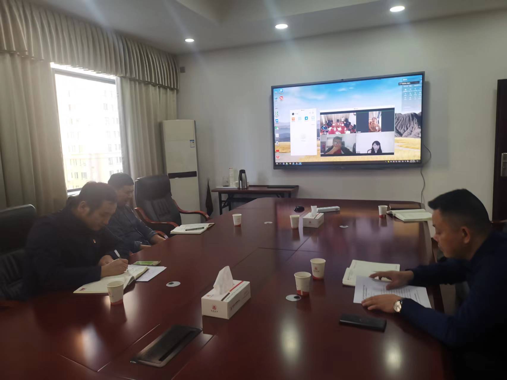 农村公路部党支部书记邓志斌在张家界出差落实“一稳三保”任务,通过视频连线主持学习讨论,挂职高速项目的刘顺伟、跟班学习的仝秋果也通过视频加入学习。