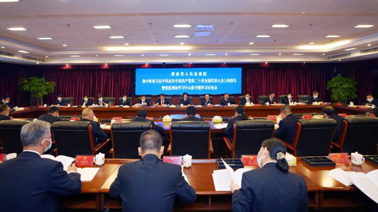 10月16日,湖南省人民检察院举行党组理论学习中心组2022年第11次(扩大)学习,集中收看中国共产党第二十次全国代表大会开幕盛况,共同聆听习近平总书记代表第十九届中央委员会向大会作的报告。省检察院党组书记、检察长叶晓颖主持学习。