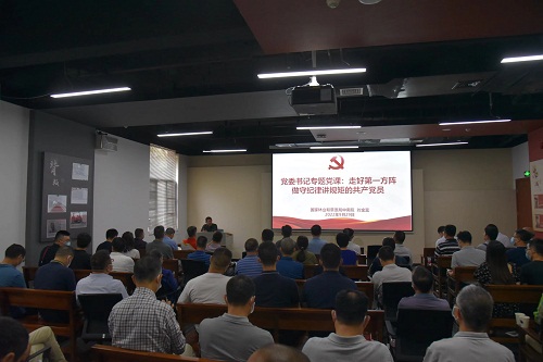 随后,刘金富在会议室以“走好第一方阵、做守纪律讲规矩的共产党员”为主题,结合中南院实际,从为什么要做“守纪律、讲规矩”的共产党员、共产党员守什么纪律、讲什么规矩及共产党员怎样守纪律、讲规矩三个方面给全体党员讲了一堂发人深省、催人深思的专题党课。他强调,守纪律、讲规矩永远在路上,全院党员干部要始终牢记党纪党规、守住底线红线,把心思和精力用在干事创业上、用在为职工群众服务上,以昂扬的精神风貌和饱满的工作热情走好第一方阵,为推动中南院各项事业高质量发展和生态文明建设贡献智慧和力量,以实干实绩迎接党的二十大胜利召开。最后,刘金富还就国庆期间的安全生产和警示教育等工作进行了强调部署。