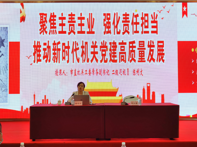 陈利文以《聚焦主责主业、强化使命担当,不断推动新时代机关党建高质量发展》为题,从坚持党对一切工作的领 导;新时代机关党的建设新要求;新时代机关党的建设新任务;新时代机关党的建设新举措等四个方面,对《中国共产党党和国家机关基层组织工作条例》进行了全面解读,并就如何贯彻落实好习近平总书记关于机关党建的重要讲话重要论述的主要精神和省委、市委关于机关党建的一系列新部署新要求,指明了目标方向、提出了具体举措。