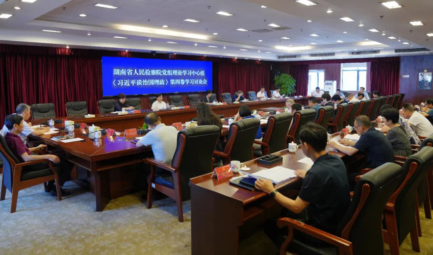8月29日下午,省检察院组织党组理论学习中心组2022年第九次(扩大)学习研讨会,学习《习近平谈治国理政》第四卷和《习近平经济思想学习纲要》,开展研讨交流。省检察院党组书记、检察长叶晓颖主持会议并讲话,强调要在学好用好《习近平谈治国理政》第四卷上树立湖南检察标杆,把忠诚拥护“两个确立”、坚决做到“两个维护”体现在岗位上、落实到行动中,以实际行动迎接党的二十大胜利召开。