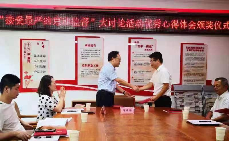 8月24日下午,岳阳市直机关工委组织市直单位机关(基层)纪委“接受最严约束和监督”大讨论活动优秀心得体会颁奖仪式,工委书记李桂华和工委委员、市直纪检监察工委书记张海燕出席并为获奖者颁发荣誉证书,四级调研员蔡春辉主持。
