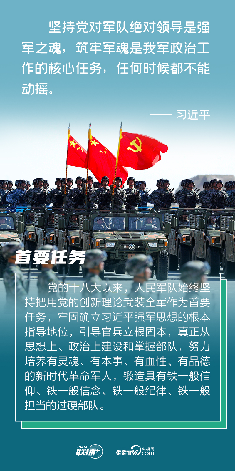 “强国必须强军,军强才能国安。坚持党指挥枪、建设自己的人民军队,是党在血与火的斗争中得出的颠扑不破的真理。”