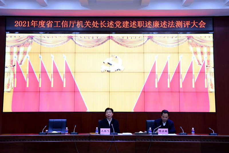 1月21日下午,省工信厅召开2021年度机关处长述党建述职述廉述法测评大会。厅党组书记、厅长毛腾飞作总结讲话,会议由厅党组副书记、副厅长杨亲鹏主持,在家厅领导、厅机关全体干部、厅属单位主要负责人参加会议。