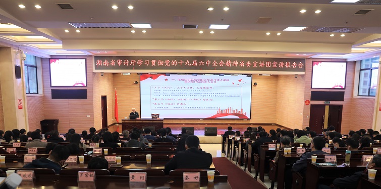 12月16日上午,学习贯彻党的十九届六中全会精神省委宣讲团在省审计厅举行宣讲报告会,省委宣讲团成员、省社科院党组成员、副院长贺培育作宣讲报告。省审计厅党组书记、厅长胡章胜主持会议并讲话,省审计厅全体干部职工聆听了报告。