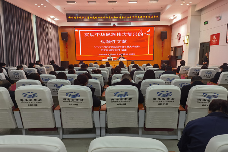 为进一步掀起学习贯彻落实党的十九届六中全会和湖南省第十二次党代会精神热潮,根据省委、厅党组部署要求,湖南图书馆党委在全馆举办专题读书班学习宣传贯彻会议精神。12月15日上午,党委书记伍艺代表馆党委宣读了关于开展学习宣传贯彻党的十九届六中全会和湖南省第十二次党代会精神读书班的方案,并邀请到湖南省委党校党建教研部主任李美玲以《实现中华民族伟大复兴的纲领性文献——<中共中央关于党的百年奋斗重大成就和历史经验的决议>解读》为主题进行会议精神宣讲,全体党委班子成员和全馆员工参加。