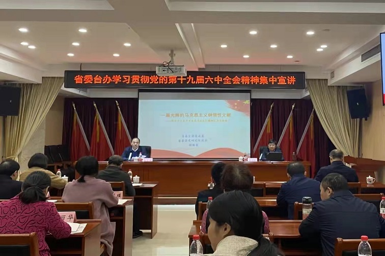 为进一步学习宣传贯彻党的十九届六中全会精神,深化拓展党史学习教育,教育引导党员干部进一步增强“四个意识”、坚定“四个自信”、 做到“两个维护”,切实凝聚响应党中央号召,推进湖南对台工作高质量发展的强大动力。12月10日上午,省委台办举行党的十九届六中全会宣讲报告会,省委党史研究院院长胡振荣作宣讲报告。省委台办主任阳卫国主持会议,在家办领导以及办机关全体干部职工参加学习。