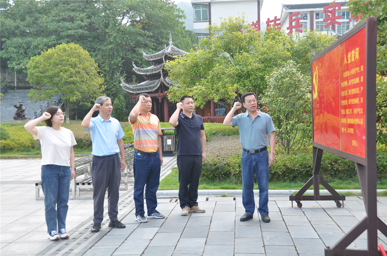 习近平总书记考察湖南时指出:“湖南是一方红色热土,走出了毛泽东、刘少奇、任弼时、彭德怀、贺龙、罗荣桓等老一辈革命家,发生了秋收起义、湘南暴动、通道转兵等重大历史事件,大批共产党人在这片热土上谱写了感天动地的英雄壮歌。”在通道转兵旧址(恭城书院)现场教学中,支部党员们聆听学习了通道会议的斗争经过和重大历史意义,旧址简陋朴实的房屋和生活用品,生动再现了红军长征的艰苦卓绝。在通道转兵纪念馆,支部党员们重温红军长征“通道转兵”这一辉煌历史,深刻缅怀革命先烈,追寻、传承长征精神。全体党员面向党旗,郑重地举起右拳,庄严地举行了重温入党誓词仪式。