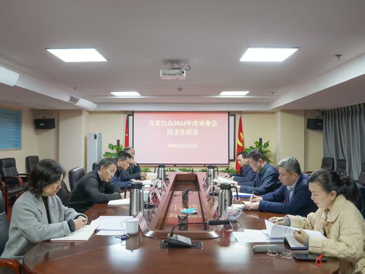 根据党中央部署和省委要求,2月21日,省委台办室务会班子召开2024年度民主生活会,会议围绕“深入学习贯彻习近平新时代中国特色社会主义思想,巩固深化党纪学习教育成果,综合发挥党的纪律教育约束、保障激励作用,为进一步全面深化改革、推进中国式现代化提供坚强纪律保证”这一主题,联系工作实际,严肃开展批评和自我批评,明确整改方向和举措,以实际行动深刻领悟“两个确立”的决定性意义、做到“两个维护”。省委台办主任曾智夫主持会议并作总结讲话。2024年度省直单位领导班子民主生活会督导组、省纪委监委驻统战部纪检组领导参加会议。