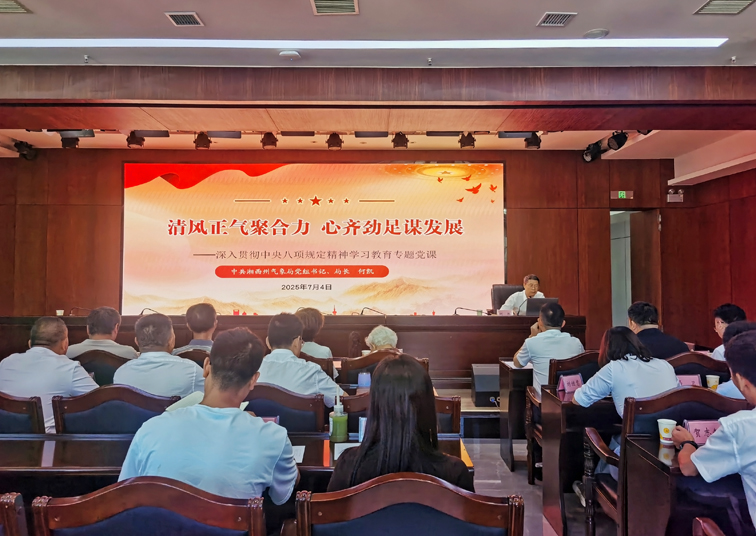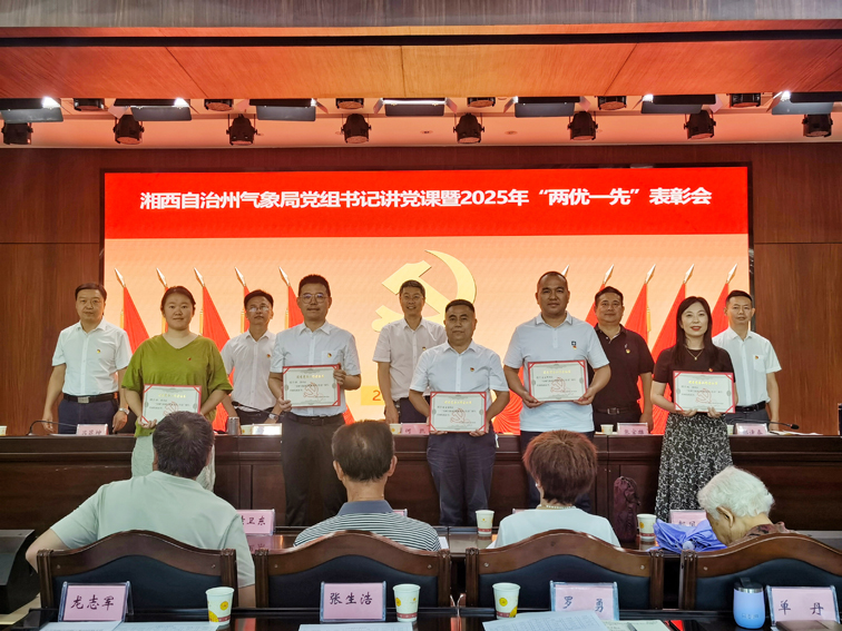 为推动深入贯彻中央八项规定精神学习教育走深走实,充分发挥先进典型表率示范作用,7月4日,湘西自治州气象局召开党组书记讲党课暨2025年“两优一先”表彰会。州气象局全体在职党员,退休老党员代表,全州8县(市)气象局“两优一先”表彰对象参会。