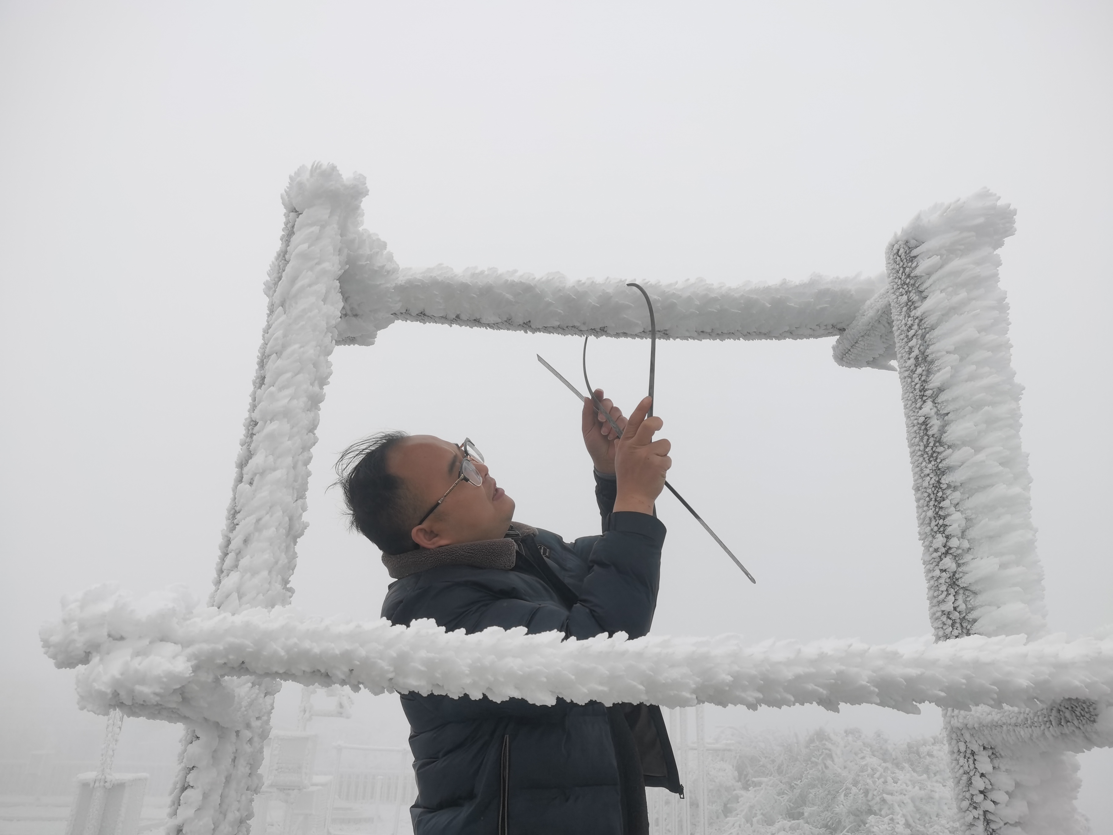 在海拔1265.9米的南岳高山气象站,观测员肖研和丁心顶着凛冽寒和冻雨,艰难进行加密观测。此时室外温度已降至零下9.4℃,整个观测场的设备都覆上了一层厚厚的“冰甲”。