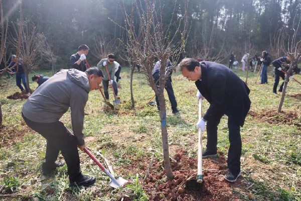 昭山基地内,草木初萌,生机盎然。尽管晨间略带微寒,但植树现场却是一派热火朝天的劳动景象。参加活动的干部职工们精神饱满、干劲十足,大家三五人一组,迅速投入到植树劳动中。挥锹铲土、扶正树苗、培土围堰、提水浇灌……每一道工序都做得认真细致、一丝不苟。经验丰富的同志一边劳作一边指导年轻干部:“土要踩实,水要浇透,这样树苗才能更好地扎根。”经过一番辛勤劳作,100株新苗木在这片土地上“安家落户”。金丝楠木、龙李、黄桃、茶花、樱花等树种错落有致、翠影初成,在和煦的春光中展现出勃勃生机,为初春的昭山基地孕育了一片新的希望。